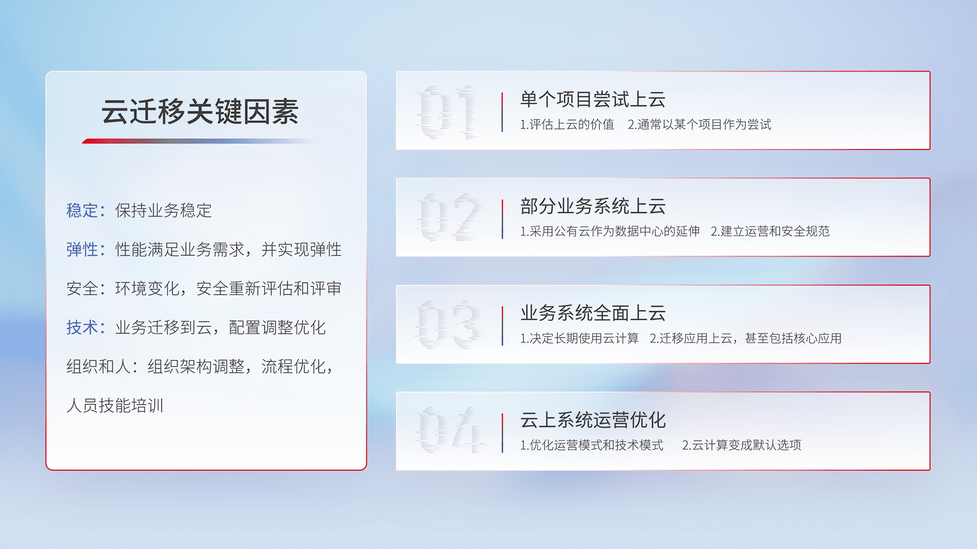 结合实际业务,,从规划设计、、、云平台选型、、、、云原生改造、、、数据迁移、、、、集成交付,,,迁移全过程为客户识别最佳上云路径,,,做好风险识别管理,,,设计网络架构、、身份权限、、、安全审计合规、、操作审计、、日志审计、、、监控告警策略、、、多站点容灾设计等,,对云上基础设施进行整体规划,,,提升IT治理水平,,,以满足弹性、、、高可用、、、、高性能的需求。。