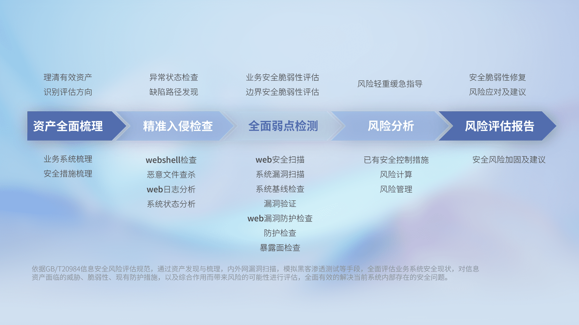 针对客户行业特性,,,,以专业的安全服务+多厂商联合解决方案提供专属的一站式安全管理服务,,,,帮助客户全面感知网络空间威胁,,基于识别、、、、检测、、、、分析、、、、防护、、、、监测、、、、响应的服务理论模型,,,从方案咨询、、、、集成交付、、、评估验证、、、、优化加固、、运维运营,,,,致力于为客户提供完整的闭环管理式安全服务。。以实战经验为客户打造高抵御风险的安全体系,,,帮助客户发现威胁、、、对抗威胁、、、处置威胁,,不断积累安全对抗能力,,持续保障数字化安全。。。。